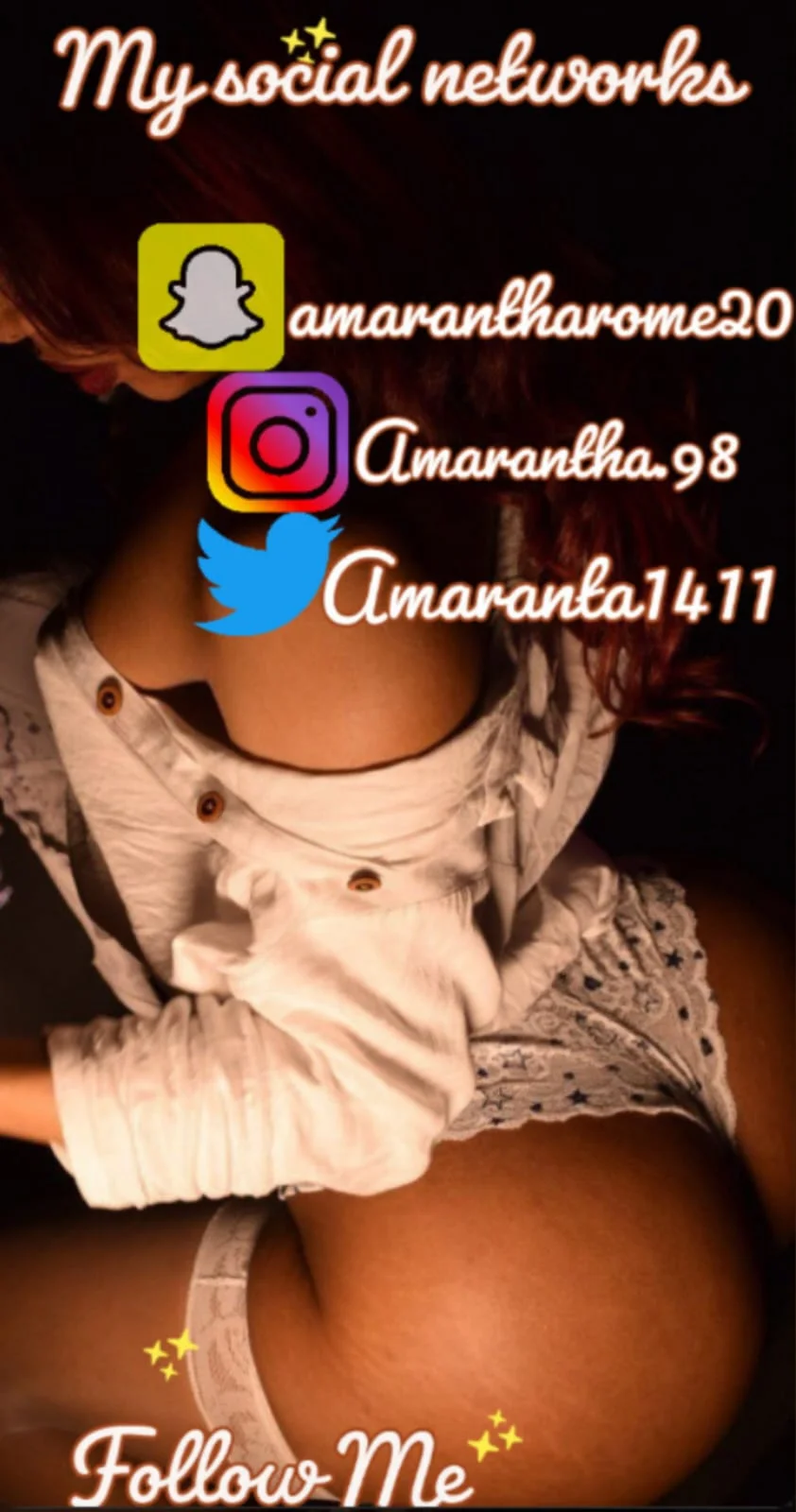 HI GUYS, FIRST OF ALL I THANK YOU FOR THE MEMBERSHIP OF MY ACCOUNT, THANK YOU VERY MUCH FOR FOLLOWING ME AND STARING ME I AM AMARANTA I AM HERE WITH THE PURPOSE OF GETTING TO KNOW YOU, SHARING PLEASANT MOMENTS, SHARING YOUR FETISHES AND CARNAL DESIRES. I'M READY FOR FUN AND YOU? I LOVE INTELLIGENT MANES AND THAT THEY HAVE THE ABILITY TO CONQUER ME. XOXO